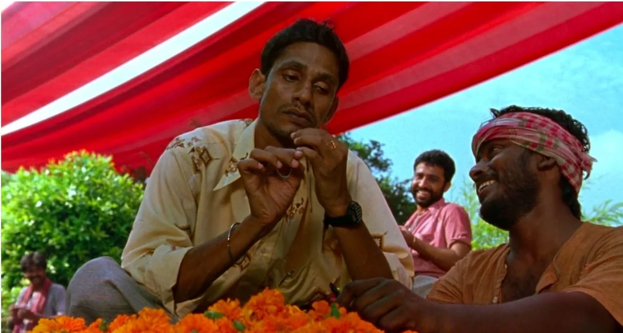 Under a blazing red canopy, Dubey is daydreaming and eating marigold petals. At his side, Tameez-ud-din snips the stems off the flowers.