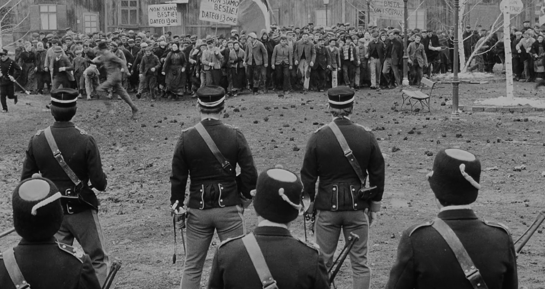 As the camera pans, we see strikers and their families march through the city to the factory, singing. They’re joined by a second group, also carrying the Kingdom of Italy flag.*