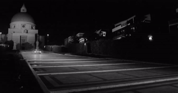 Una decappottabile bianca scende di corsa lungo la scalinata di pietra davanti alla Basilica dei Santi Pietro e Paolo. I fari brillano ad ogni gradino. Adriana è in piedi, aggrappata al parabrezza, mentre l'uomo di nero guida. Entrambi ridono, estasiati.