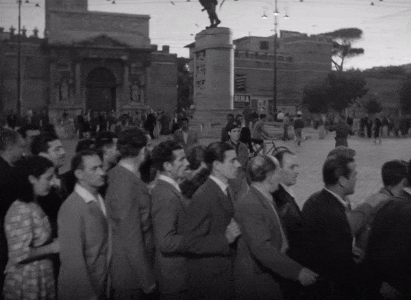 The painfully slow advance of the crowd toward the bus’s open door contrasts strikingly with Antonio’s solitary ease on the bicycle.