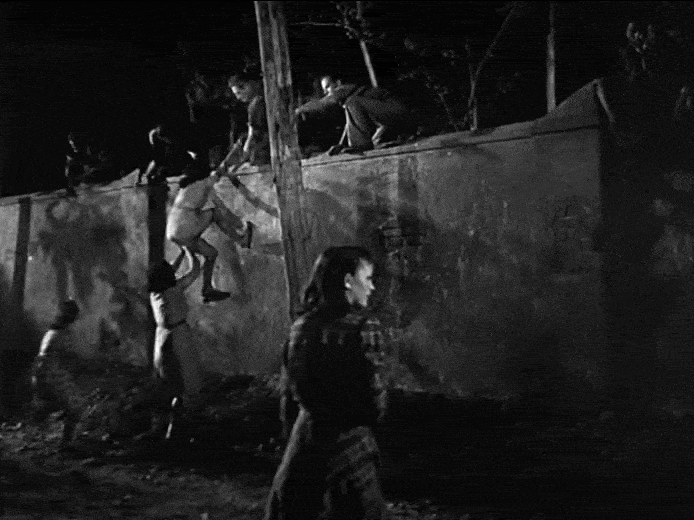 It’s nighttime. A tracking shot* shows men helping women over the wall of the rice field. Steadily rising, the camera reveals couples meeting and walking among the trees on the far side.