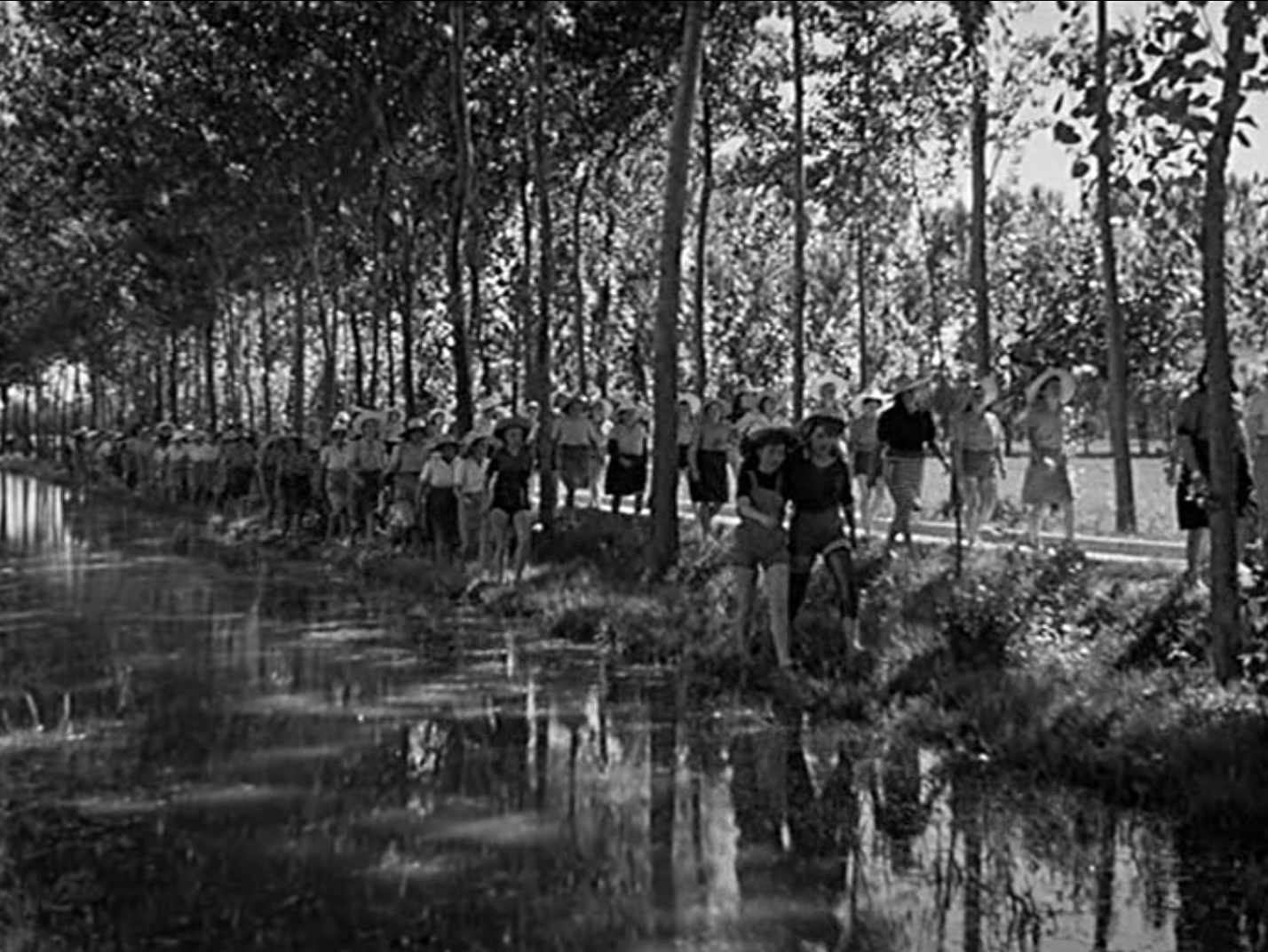 Le mondine con i cappelli di paglia passeggiano chiacchierando lungo il fiume che riflette gli alberi lungo le rive: una splendida inquadratura in cui luce e ombra si bilanciano perfettamente. Alcune donne camminano a braccetto.