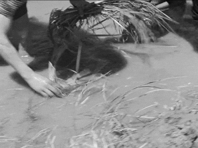 A tight pan in the rice field shows us the women in their hats, bent over, picking the rice stalks. While the women break their backs, the foremen lean comfortably on their poles, shouting instructions: