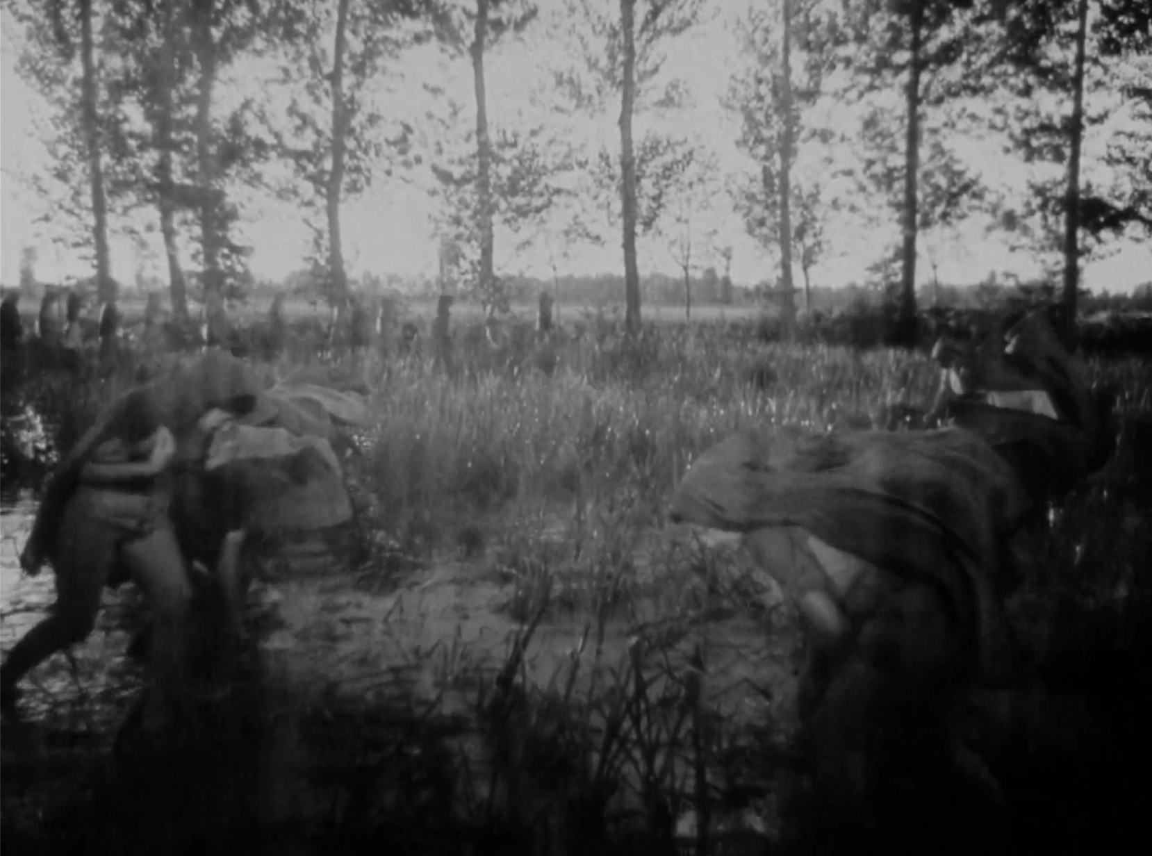 Leaning against a tree, she falls to the ground sobbing as the blows continue.