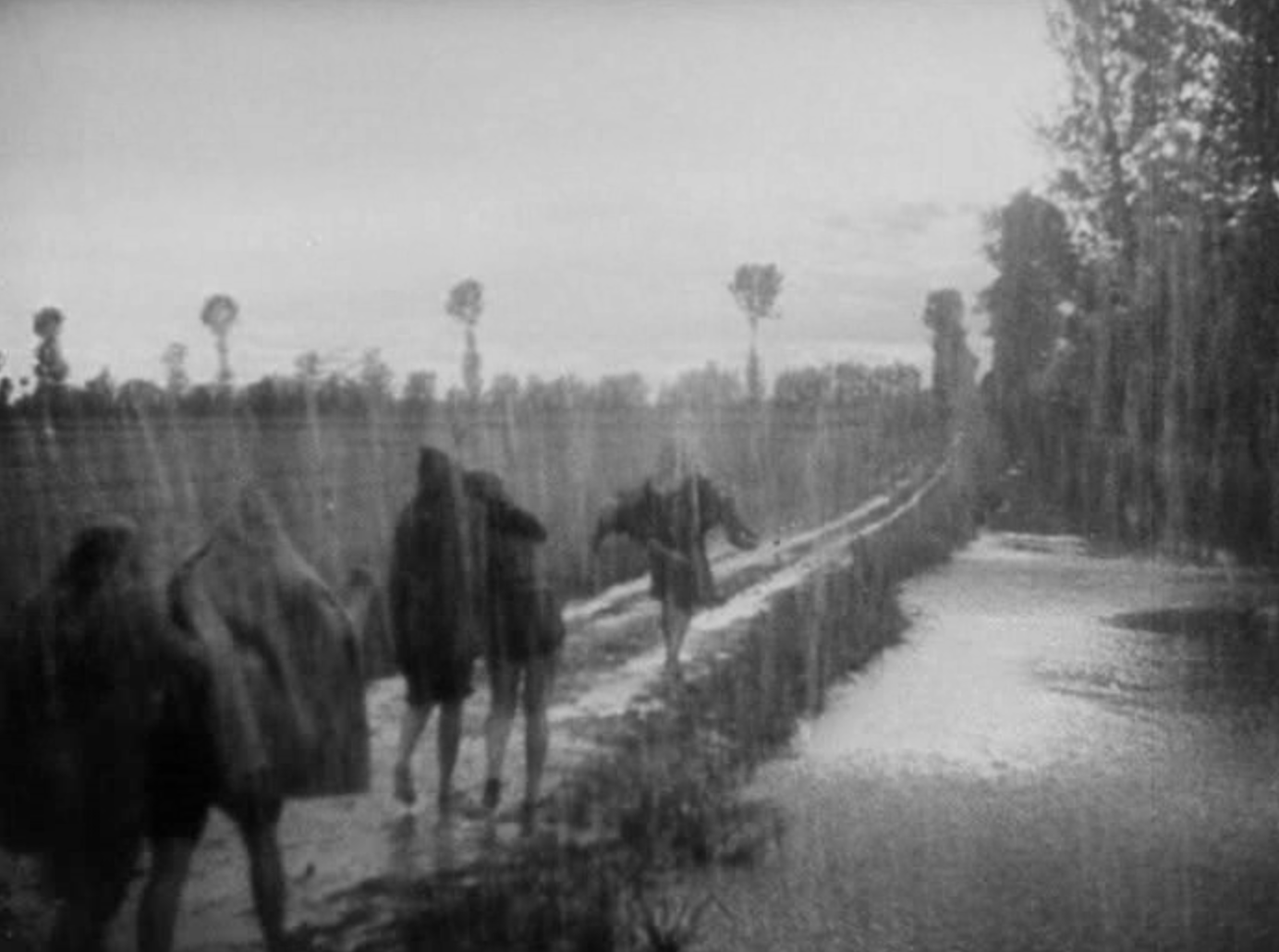 Silvana e Granata corrono sotto un arco per ripararsi dalla pioggia. Si appoggiano alle pareti, guardando le donne che corrono verso il fiume.